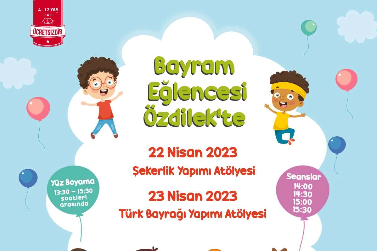 Özdilek Yalova’da Şekerlik Yapımı Atölyesi ile 22 Nisan Cumartesi günü çocuklar,hem el becerilerini geliştirecek hem de çok eğlenecek. 14:00/ 14:30 / 15:00 / 15:30 seanslarıyla gerçekleşecek atölye etkinliklerinde minik misafirler, kendi bayram hatıralarını oluşturacaklar. 23 Nisan Ulusal Egemenlik ve Çocuk Bayramı’nda ise bayram coşkusunu doyasıya yaşamak için Atatürk resimli bayraklar dağıtılacak. Aynı zamanda saat 14:00 / 14:30 / 15:00 / 15:30 seanslarıyla gerçekleşecek Türk Bayrağı Yapımı Atölyesi ile minikler çifte bayram coşkusunu yaşayacak. Minik misafirlerin ve ailelerinin, konforlu ve keyifli vakit geçirmeleri için çeşitli aktiviteler düzenleyen Özdilek Yalova, Ramazan Bayramı ile 23 Nisan Ulusal Egemenlik ve Çocuk Bayramı’nı kutladığını belirtti.