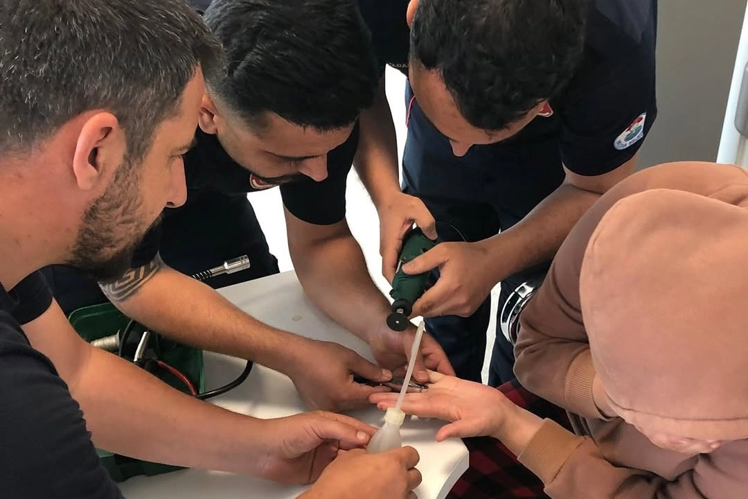 Hastaneye gelen itfaiye ekipleri, cerrah hassasiyeti ve titizliği ile müdahale ederek genç kızın parmağını sıkıştıran yüzüğü dikkatli ve sorunsuz bir şekilde çıkarttı.