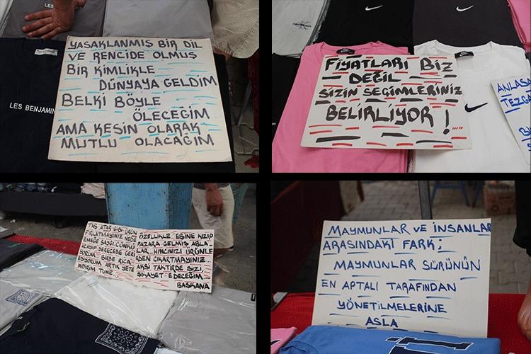 “Açın ama hepsini değil, iki tane açabilirsiniz. Nedeni ise zaten iki beden bulunmaktadır, başka bir beden yok. Ne sen yorul ne ben. Hem istediğini daha rahat bulursun”, “Ürünü nasıl alıyorsanız aynı yerine koyar mısınız lütfen. Emeğe saygı! Çok dağıtmadan bakınız”, “Anlasana kadın tezgâha giremiyorum, neden biliyor musun? Senden ötürü”, “Fiyatları biz değil sizin seçimleriniz belirliyor”, “Okuyorsun ama gene de tezgâhın önünde durmaya devam ediyorsun. Anlamıyor musun sen heykel gibi duruyorsun kadınlar senin yüzünden tezgâha yanaşamıyor.”