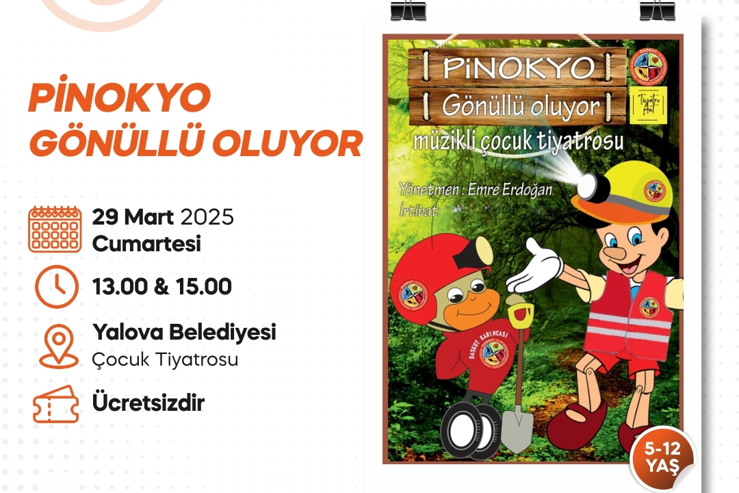 Emre Erdoğan’ın yönetmenliğini üstlendiği oyun, çocuklara eğlenceli anlar yaşatırken aynı zamanda gönüllülük bilincini aşılayacak. Etkinlik, Yalova Belediyesi Çocuk Tiyatrosu'nda saat 13.00 ve 15.00 olmak üzere iki seans halinde ücretsiz olarak sahnelenecek. 5-12 yaş grubu çocuklara hitap eden tiyatro oyunu için rezervasyonlar etkinlik.yalova.bel.tr adresinden yapabilecek.