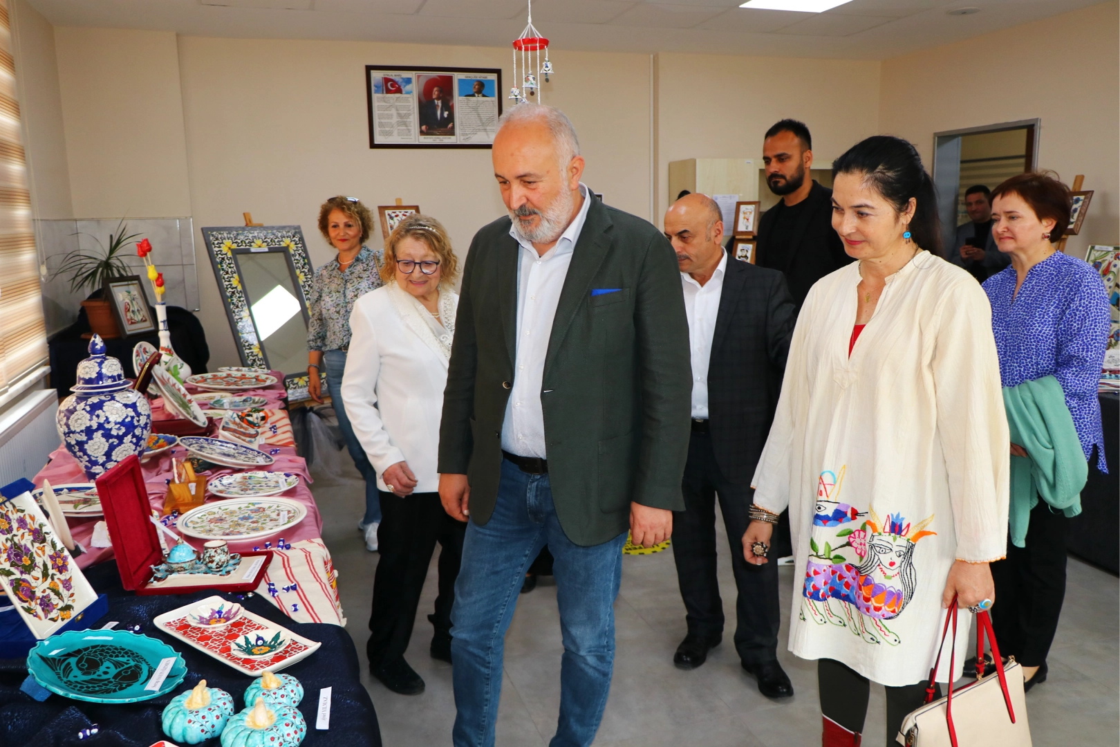 İlçe Halk Eğitim Merkezi Müdürlüğü öğretmen ve kursiyerlerinin el sanatları, giyim üretimi, çini, resim, hat, telkâri gibi branşlarda hazırladığı eserlerin yer aldığı sergiyi İlçe Halk Eğitim Merkezi Müdürü Zekeriya Yayla ile birlikte gezen Başkan Silpagar, kursiyerleri başarılı eserlerinden dolayı tebrik etti. İlçe Halk Eğitim Merkezi Müdürü Zekeriya Yayla, etkinlikle ilgili bilgi vererek, Çiftlikköy’deki çok sayıda kursiyere pek çok alanda eğitim verdiklerini dile getirdi ve yeni açılan hat sanatı gibi kurslara da ilginin yüksek olmasının sevindirici olduğunu ifade etti. Başkan Silpagar, hüsn-i hat sanatı usta öğreticisi Hümeyra Yekeler’in standını da ziyaret ederek hüsn-i hat denemesi yaptı. Çiftlikköy İlçe Halk Eğitim Merkezi’nde resim, çini, giyim, turistik eşya, rölyef gibi birbirinden farklı tarzlarda kursiyerlerin yaptığı eserlerin yer aldığı sergileri ilgiyle gezen Başkan Silpagar, “Çiftlikköy Halk Eğitim Merkezimizin 2022-2023 Eğitim Öğretim Dönemi Yıl Sonu Karma Sergisi'nde yer alan tüm kursiyerlerimizi ve emeği geçen herkesi başarılı eserlerinden dolayı tebrik ediyorum” dedi.