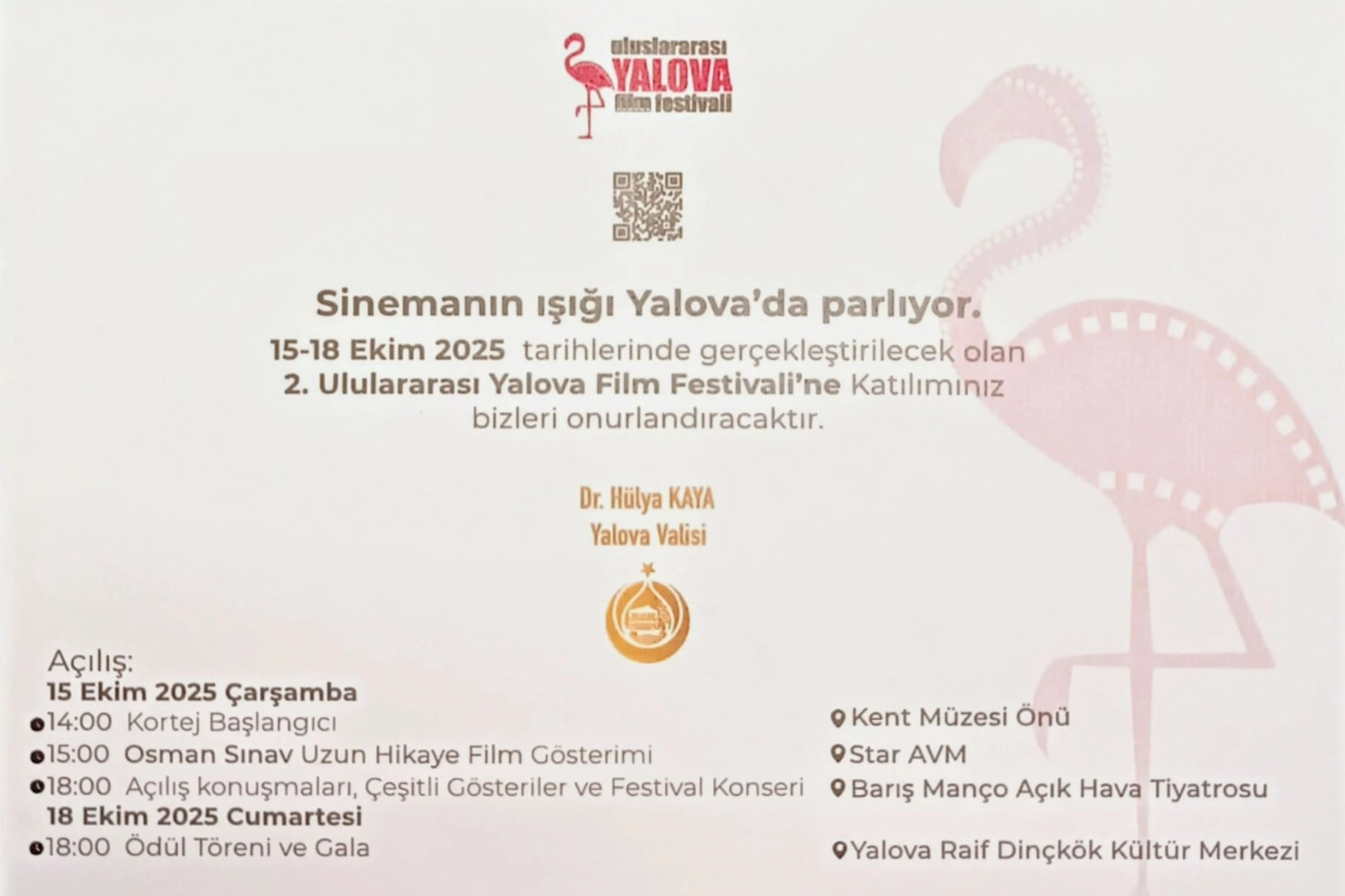 Yalova Valisi Dr. Hülya Kaya’nın himayelerinde düzenlenecek festivalde; film gösterimleri, çeşitli etkinlikler, konserler ve ödül töreniyle dolu dolu bir program Yalovalıları bekliyor. Yalova İl Kültür ve Turizm Müdürlüğü’nden yapılan açıklamada “Sinemanın büyüsünü hep birlikte yaşayacağımız bu özel festivalde sizleri de aramızda görmekten onur duyarız” denildi.
