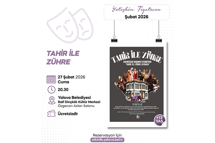Yalovalı sanatseverlerin yoğun ilgi göstermesi beklenen oyun, duygu yüklü hikâyesiyle izleyicilere unutulmaz bir akşam yaşatacak. Türk halk edebiyatının en bilinen aşk hikâyelerinden biri olan Tahir ile Zühre, sahne uyarlamasıyla yeniden hayat buluyor. Ademizade Mahmut Efendi’nin “Tahir ile Zühre Sevdası” eserinden uyarlanan yapım; dönem atmosferini yansıtan kostüm ve dekor tasarımı, güçlü oyuncu kadrosu ve etkileyici anlatımıyla dikkat çekiyor. Aşk, sadakat ve fedakârlık temalarını işleyen oyun, klasik bir halk hikâyesini modern sahne diliyle izleyiciye aktarıyor. +13 yaş ve üzeri izleyicilere açık olan etkinlik ücretsiz olarak sanatseverlerle buluşacak. Etkinliğe katılmak isteyen vatandaşlar, rezervasyon işlemlerini etkinlik.yalova.bel.tr adresi üzerinden gerçekleştirebilecek. Yalova Belediyesi, yıl boyunca düzenlediği kültür ve sanat etkinlikleriyle kenti sanatla buluşturmaya devam ederken, tiyatro severleri bu özel gösterime davet ediyor.