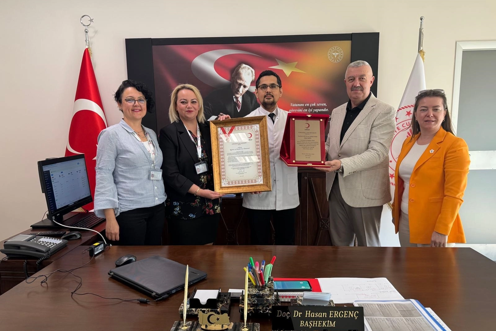 Yalova Eğitim ve Araştırma Hastanesi Başhekimlik makamında gerçekleştirilen törende, Türk Kızılayı Güney Marmara Bölge Kan Merkezi Müdürü Dr. Nihat Çakır, madalyayı Başhekim Doç. Dr. Hasan Ergenç’e takdim etti.