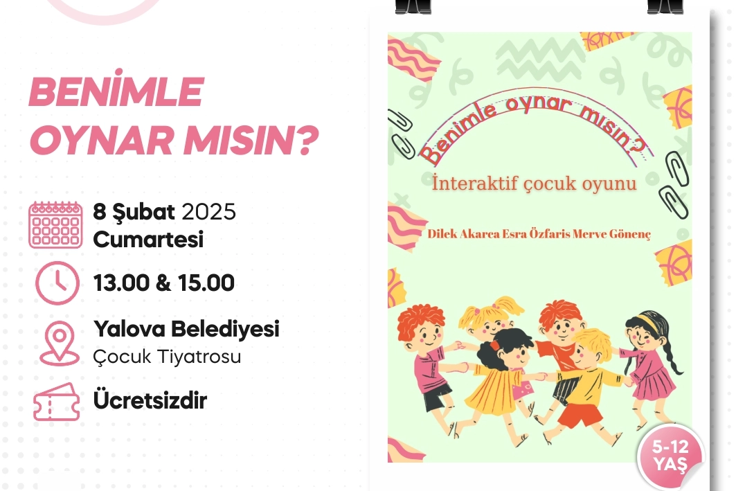 Yalova Belediyesi’nin çocuklara yönelik etkinlikleri dolu dolu devam ediyor. Bu hafta sonu Dilek Akarca, Derya Özfaris ve Merve Gönenç’in skeçleri ve oyunculuklarıyla sahne alacağı ‘Benimle Oynar Mısın?’ isimli interaktif renkli oyun, çocukları hem eğlendirecek hem de eğitici içerikleriyle onları yeni bilgilerle tanıştıracak.