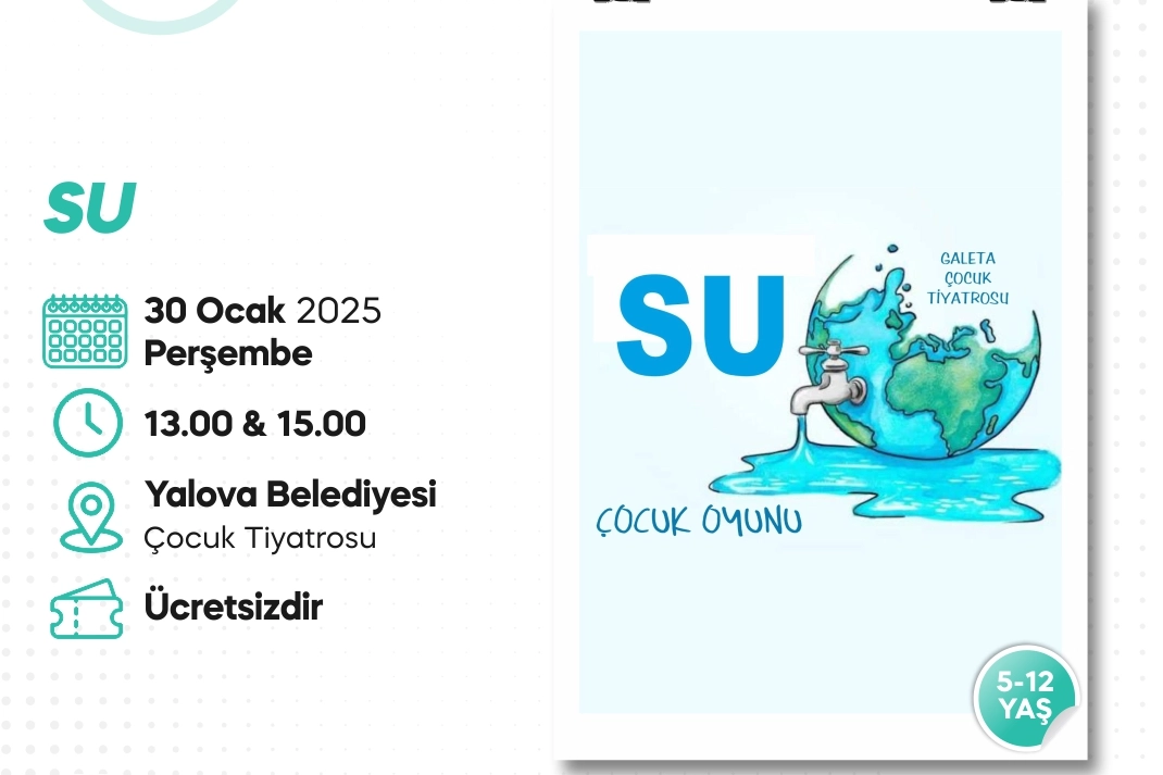 Yalova Belediyesi, çocuklara yönelik düzenlediği yarıyıl etkinliklerine start veriyor. 30 Ocak 2025 Perşembe günü, 5-12 yaş grubu çocuklar için özel olarak sahnelenecek ‘Su’ isimli tiyatro oyunu, Yalova Belediyesi Çocuk Tiyatrosu’nda Galeta Çocuk Tiyatrosu tarafından iki seans olarak sahnelenecek. Oyun, saat 13.00 ve 15.00’te izleyicilerle buluşacak.