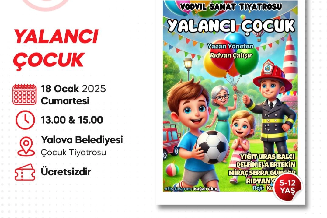 Vodvil Sanat Tiyatrosu tarafından sahnelenen ve Rıdvan Çalışır’ın yazıp yönettiği bu eğlenceli oyun, çocuklara hem eğlenceli anlar yaşatacak hem de önemli mesajlar verecek. 5-12 yaş arasındaki tüm çocuklara hitap edecek olan etkinlik, tamamen ücretsiz olarak sahnelenecek. Oyun, saat 13.00 ve 15.00 olmak üzere iki ayrı seansta sahnelenecek. Katılım için rezervasyon yapılması gerektiği belirtilirken, rezervasyonlar etkinlik.yalova.bel.tr adresinden gerçekleştirilebiliyor. Tüm çocukları ve aileleri tiyatro dolu bir gün yaşamaya davet eden Yalova Belediyesi, bu tür etkinliklerle şehrin kültürel hayatını zenginleştirmeye devam ediyor.