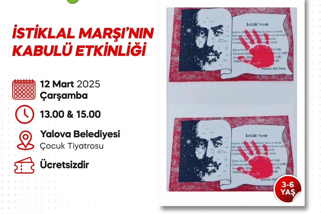 3-6 yaş aralığındaki çocuklara yönelik olarak hazırlanan bu özel etkinlik, miniklerin İstiklal Marşı’nın anlamını ve tarihini eğlenceli bir şekilde öğrenmelerine katkı sağlayacak. Etkinlik kapsamında çocuklar, sanatsal faaliyetler ve el baskısı çalışmalarıyla duygu ve düşüncelerini ifade ederek, milli değerleri de keşfetme fırsatı bulacaklar. Ücretsiz olarak düzenlenecek etkinlik, saat 13.00 ve 15.00 olmak üzere iki ayrı seansta gerçekleştirilecek. Ailelerin yoğun ilgi göstermesi beklenen program için kayıt işlemleri (0226) 813 50 90 numaralı telefon üzerinden yapılabiliyor. Yalova Belediyesi yetkilileri, çocukların erken yaşta milli değerlerle tanışmasını sağlamak amacıyla bu tür kültürel ve eğitici etkinlikleri düzenlemeye devam edecek.