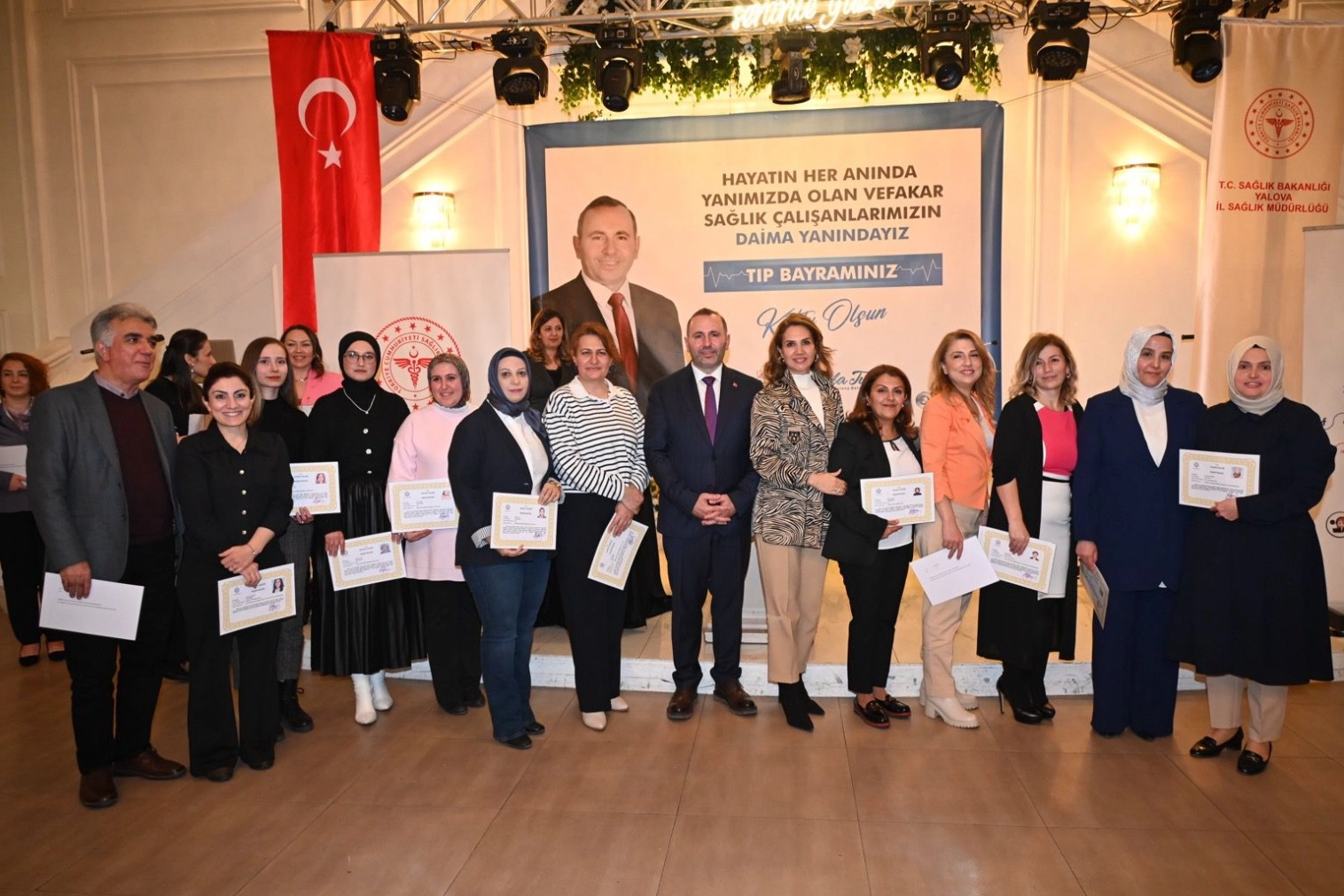Altan Kültür Merkezi’nde düzenlenen iftarın ardından, Yalova Belediye Başkanı Mustafa Tutuk ve eşi Gökşen Tutuk, meslek hayatlarında üstün başarı gösteren sağlık personellerine teşekkür belgelerini verdi. Akabinde meslekte 40. yılını dolduran sağlık personellerine de Yalova Valisi Dr. Hülya Kaya plaket taktim etti.