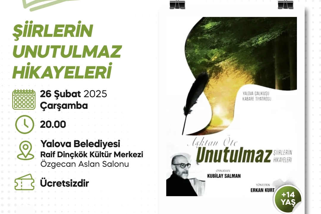 Şiir ve tiyatronun buluştuğu bu özel gece, katılımcılara sanat dolu anlar yaşatacak. 14 yaş ve üzeri herkesin katılabileceği dinleti ücretsiz olarak düzenlenecek. Şiirlerin sadece kelimelerden ibaret olmadığını, her birinin ardında derin hikâyeler barındırdığını anlatan bu etkinlik, edebiyat ve sahne sanatlarına ilgi duyan herkes için kaçırılmayacak bir fırsat. Rezervasyon için etkinlik.yalova.bel.tr adresinden kayıt yapılabileceği ifade edildi.