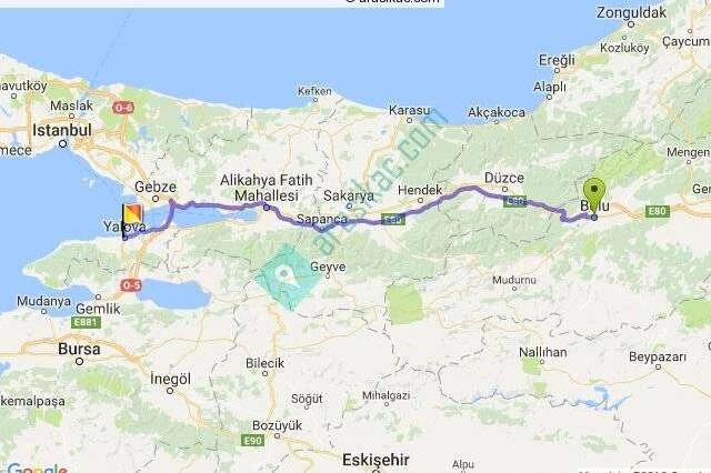 Özel araç ile yapılan veya otobüs ile yapılan yolculuk arasında araç yapısı, hız, duraklama noktaları gibi etkenler nedeniyle km ve süre farkı oluşabilmektedir. Yolculuk süresi arabanız ile yaklaşık 2 saat 32 dakika sürecektir. Yalova ile Bolu arası yaklaşık olarak toplam 232 Kilometre mesafededir.