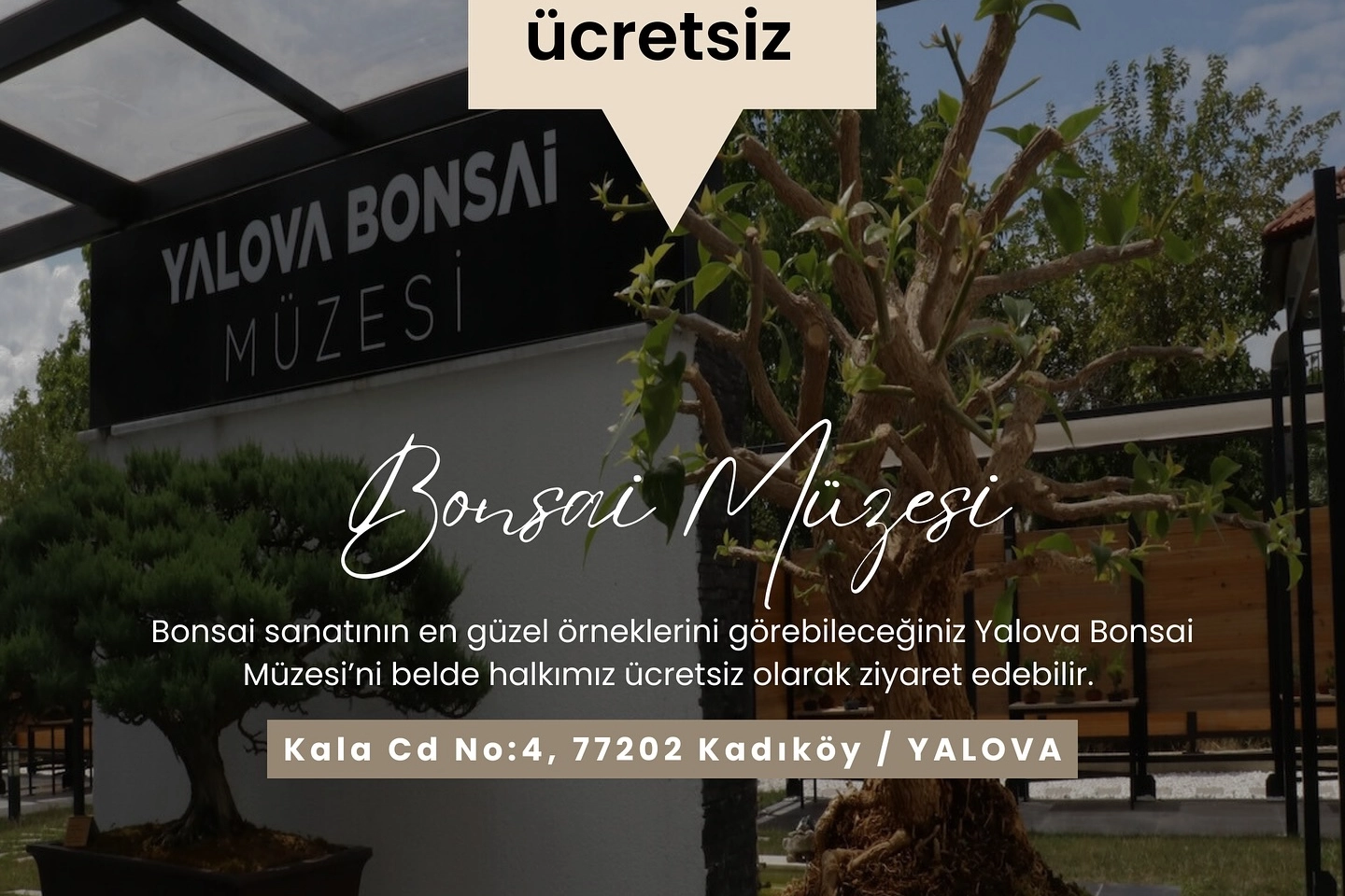 Yalova Kadıköy Belediye Başkanı Yılmaz Tavşan tarafından yapılan açıklamada, “Bonsai sanatının en güzel örneklerini görebileceğiniz Yalova Bonsai Müzesi’ni belde halkımız ücretsiz olarak ziyaret edebilir” ifadeleri kullanıldı.