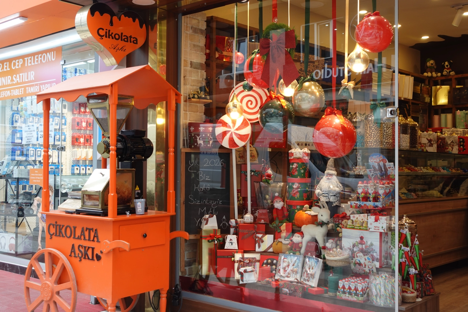 Dükkan, yılbaşı temalı çikolata çeşitlerini özenle hazırlanan süslemelerle birlikte satışa çıkararak mağaza atmosferini yeni yıl ruhuna uygun hale getirdi.