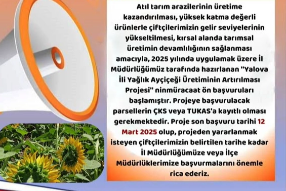 "Yalova İli Yağlık Ayçiçeği Üretiminin Artırılması Projesi" kapsamında, 2025 yılında yağlık ayçiçeği yetiştirmek isteyen çiftçilere destek sağlanacak. Projenin hedefleri, atıl tarım arazilerinin üretime kazandırılması, yüksek katma değerli ürünlerle çiftçilerin gelir seviyelerinin yükseltilmesi kırsal alanda tarımsal üretimin devamlılığının sağlanması veY alova'da yağlık ayçiçeği üretiminin artırılması.