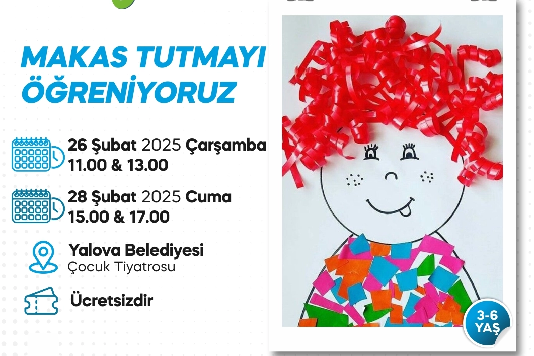 Atölye, 26 Şubat 2025 Çarşamba günü saat 11.00 ve 13.00’te, 28 Şubat 2025 Cuma günü ise saat 15.00 ve 17.00’de gerçekleştirilecek. Etkinlik, Yalova Belediyesi Çocuk Tiyatrosu’nda düzenlenecek ve tamamen ücretsiz olacak. Çocuklar, eğlenceli kesme ve yapıştırma aktiviteleriyle makas kullanmayı öğrenirken, aynı zamanda sanatsal yönlerini geliştirme fırsatı bulacaklar. Aileler, çocuklarının el becerilerini geliştirmelerine katkı sağlamak ve eğlenceli vakit geçirmelerini sağlamak, kayıt ve detaylı bilgi almak için 0226 813 50 90 numaralı telefondan iletişime geçebilecekler.