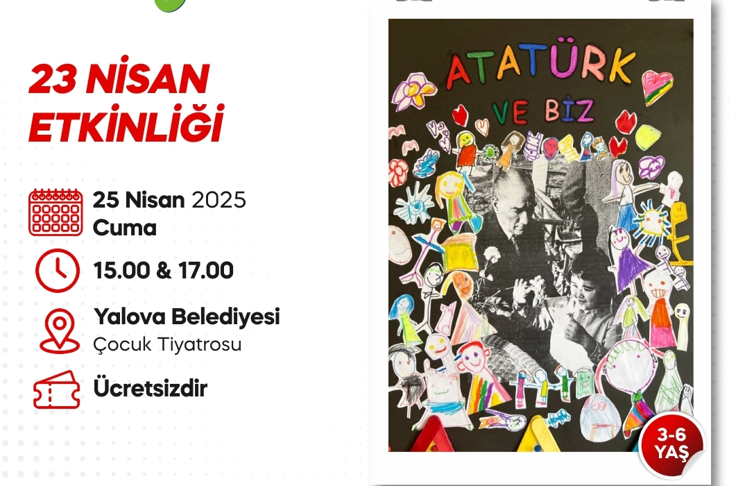 “ATATÜRK VE BİZ” ATÖLYESİYLE 23 NİSAN’A ÖZEL KUTLAMA25 Nisan Cuma günü Yalova Belediyesi Çocuk Tiyatrosu’nda gerçekleşecek olan ‘23 Nisan Etkinliği: Atatürk ve Biz’ başlıklı atölye çalışması, 3-6 yaş grubundaki miniklere yönelik hazırlandı. Saat 15.00 ve 17.00 olmak üzere iki oturumda yapılacak atölye, çocuklara hem eğlenceli bir sanat faaliyeti sunacak hem de Atatürk sevgisini pekiştirecek. Etkinlikte çocuklar, Atatürk temalı kolaj ve çizim çalışmalarını yaparken sosyal becerilerini geliştirme ve bayram coşkusunu doyasıya yaşama fırsatı bulacak. Katılımın ücretsiz olduğu atölyeye kayıt için 0226 813 50 90 numaralı telefon üzerinden başvuru yapılabiliyor.