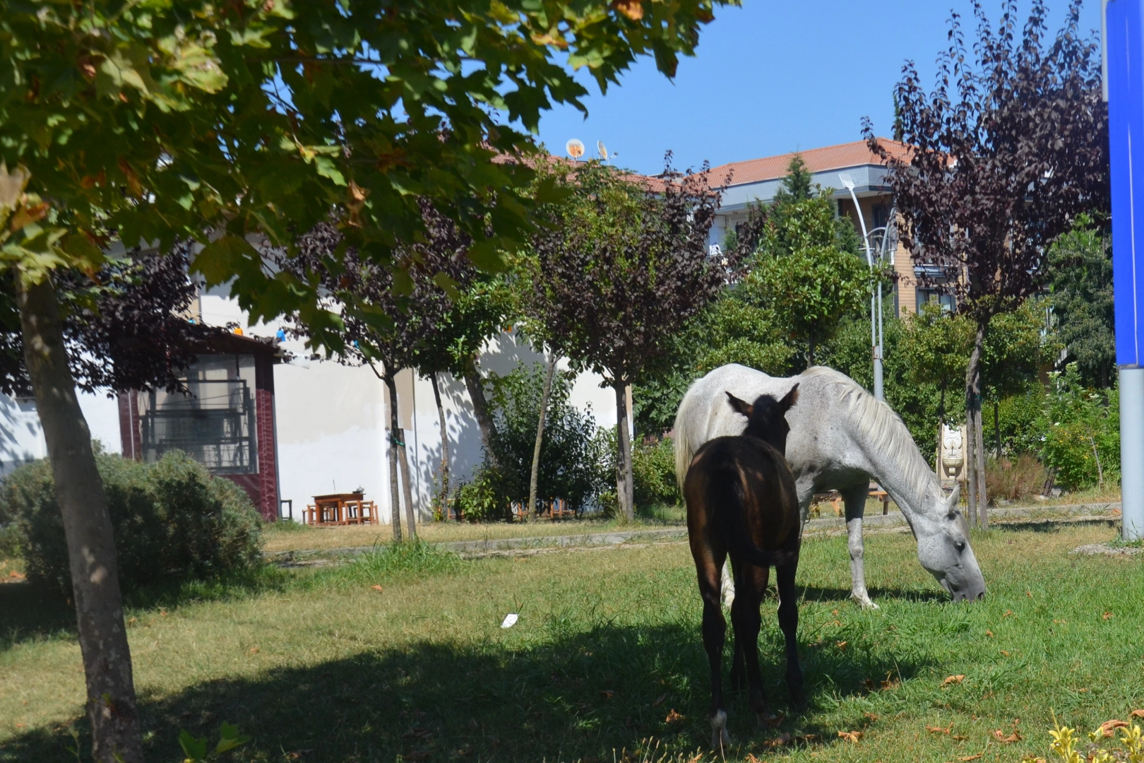 Öğle vakitlerinde 38 dereceye yaklaşan sıcaklar nedeniyle iki tane at, çareyi şehirde ki bir parkta ağaç gölgesinde serinleyerek buldu.