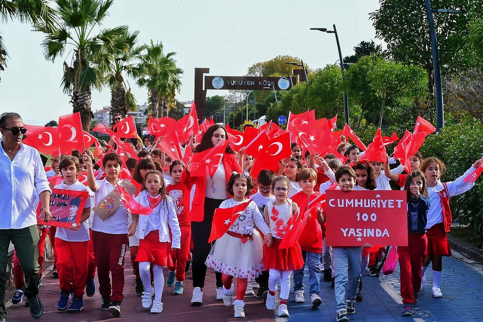 Ay yıldızlı bayraklarıyla Yürüyen Köşk’e akın eden yüzlerce öğrenci, köşk bahçesinde görsel şölen yaşattı.