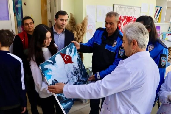 Resim Kursunda Minik Ellerden Büyük Eserler Kursun son etkinliğinde, Yalova Emniyet Müdürlüğü yetkilileri, minik ressamlarla bir araya gelerek onların çalışmalarını yakından inceledi.