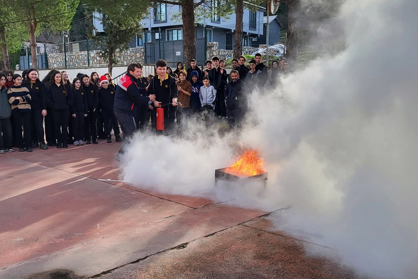 Kulüp çalışmaları ve sosyal faaliyetler kapsamında gerçekleştirilen eğitim, öğrencilere yangına müdahale konusunda bilgi verirken farkındalık yaratmayı amaçladı.
