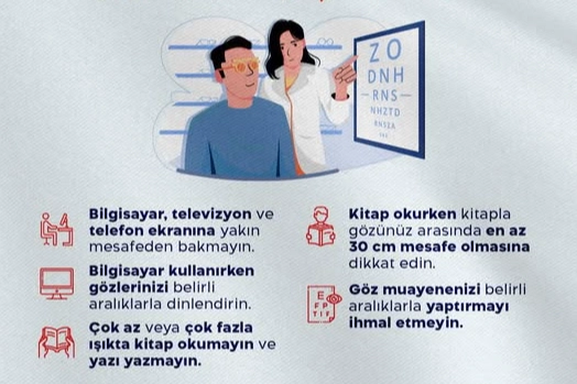 İl Sağlık Müdürü Uzm. Dr. Halim Ömer Kaşıkcı’nın öncülüğünde , göz sağlığını korumak için dikkat edilmesi gereken temel noktalar kamuoyuyla paylaşıldı. Yalova İl Sağlık Müdürlüğü’nün uyarılarına göre göz sağlığınızı korumak için; Ekranlardan Uzak Durun: Bilgisayar, televizyon ve telefon ekranına çok yakın mesafeden bakmaktan kaçının. Uzun süre ekran karşısında kalmak göz yorgunluğuna ve ilerleyen dönemde görme sorunlarına yol açabilir.