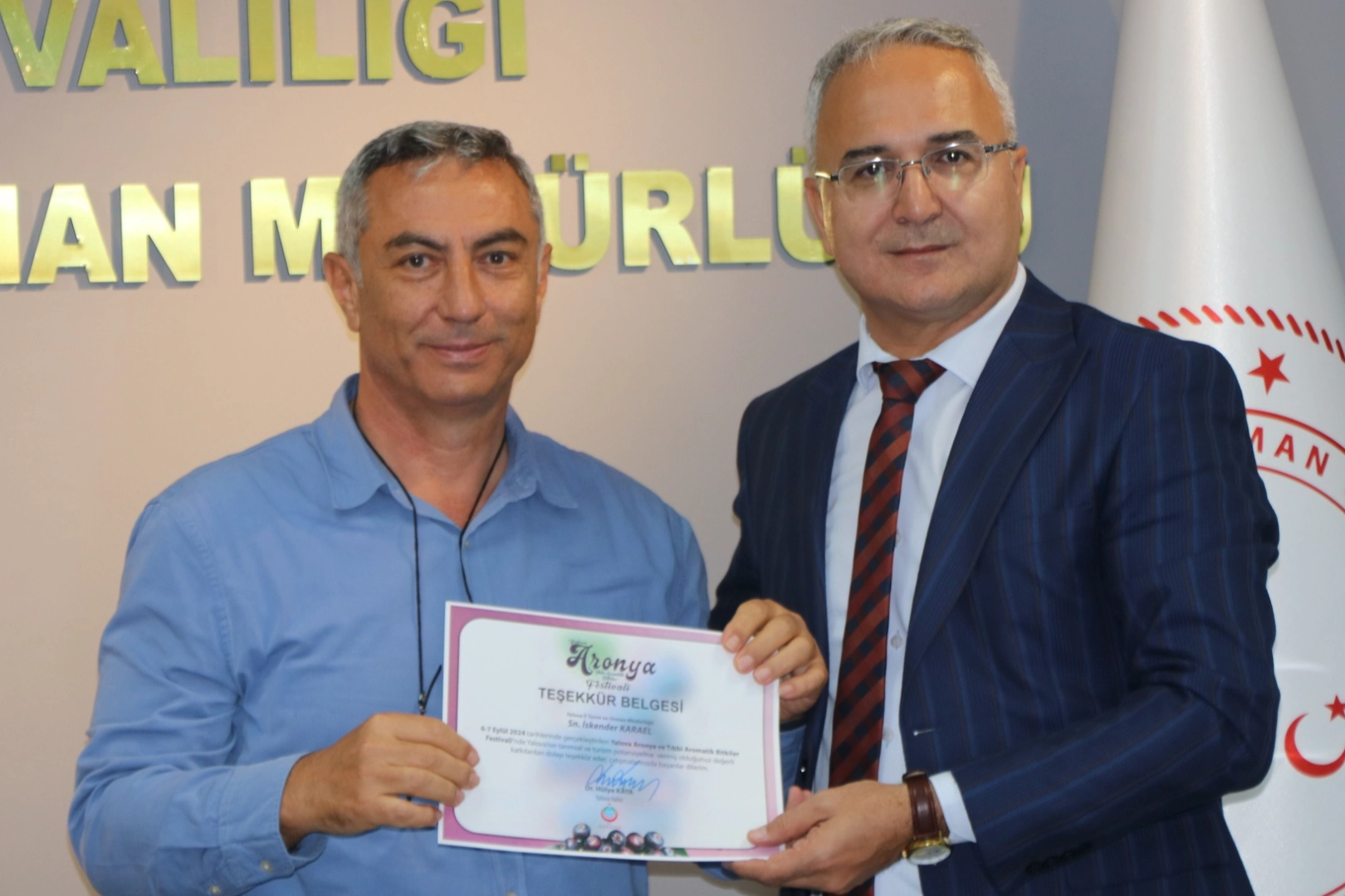 Geçtiğimiz ay Yalova’da düzenlenen Aronya ve Tıbbi Aromatik Bitkiler Festivalinde görev alan Yalova İl Tarım ve Orman Müdürlüğü personellerine teşekkür belgeleri verildi. Yalova Valisi Dr. Hülya Kaya tarafından hazırlanan belgeler, festivaldeki katkılarından dolayı, Yalova İl Tarım ve Orman Müdürlüğü Müdür Yardımcısı İrfan Sakinci tarafından çalışanlara takdim edildi.