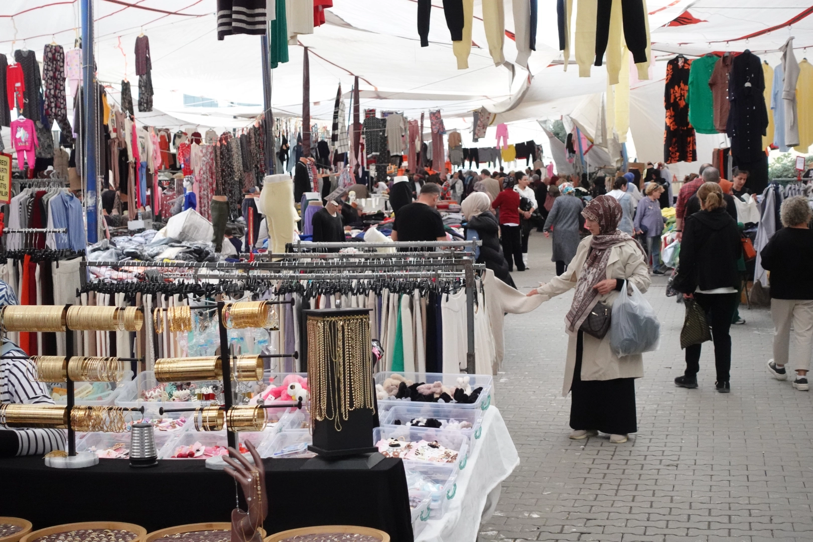 MEVSİM GEÇİŞİ ÜRÜNLERİNE BÜYÜK İLGİTezgahlarda mont, hırka, kazak, bot ve yağmurluk gibi kış ve geçiş mevsimine uygun ürünler ön plana çıktı. Özellikle sabah ve akşam saatlerinde serin havaya karşı hazırlıklı olmak isteyen vatandaşlar, kalın ve orta kalınlıktaki giysilere yoğun ilgi gösterdi.