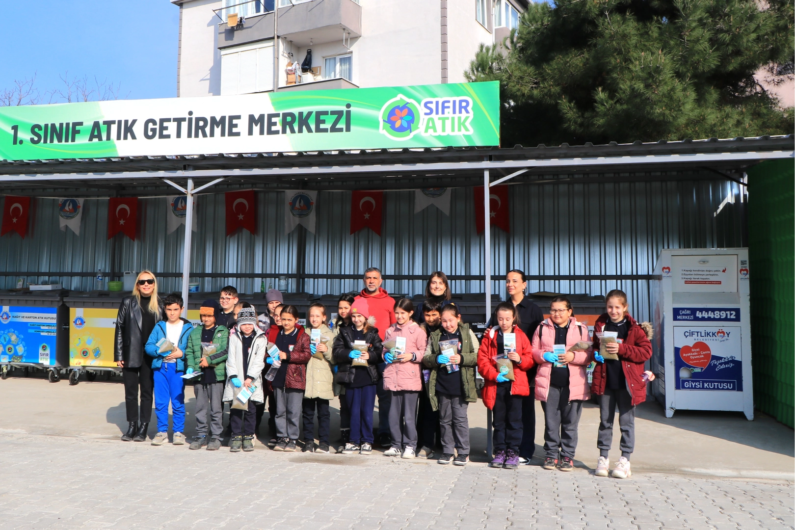 Çiftlikköy Belediye Başkanı Ali Murat Silpagar, “Çiftlikköylülerin geri dönüştürülebilir atıklarını getirerek yeniden üretim sürecine katkı sağlayabildikleri tesiste kağıt, karton, plastik, metal, cam, tekstil, elektronik malzeme, kurşunlu pil, floresan ve bitkisel atık yağlar toplanıp ayrıştırılmış bir şekilde yeniden üretime hazır hale getirilecekleri endüstriyel tesislere gönderiliyor. Geleceğimizin teminatı olan değerli öğrencilerimiz de buraya yaptıkları ziyaretlerle, çevre bilincini kazanıyor ve değersiz çöp olarak görülen maddelerin ne şekilde değerlendirilebildiğini öğreniyorlar” diye konuştu.