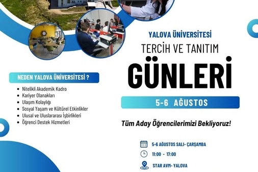 YALOVA’DA ÖĞRENCİ OLMANIN AYRICALIKLARI TANITILACAKYalova Üniversitesi sadece akademik programlarıyla değil, aynı zamanda yaşam kalitesi, doğaya yakın konumu ve öğrenci dostu şehir yapısıyla da öne çıkıyor. Tanıtım günlerinde üniversitenin kampüs ortamı, sosyal kulüpleri, Erasmus ve değişim programları gibi uluslararası olanakları da ziyaretçilere aktarılacak.