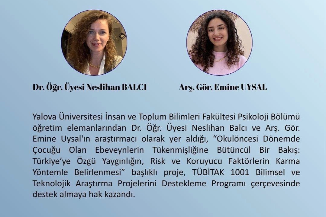 Yalova Üniversitesi Psikoloji Bölümü Öğretim Üyeleri Dr. Öğr. Üyesi Neslihan Balcı ve Arş. Gör. Emine Uysal’ın araştırmacı olarak yer aldığı, “Okulöncesi Dönemde Çocuğu Olan Ebeveynlerin Tükenmişliğine Bütüncül Bir Bakış” başlıklı proje, TÜBİTAK 1001 Bilimsel ve Teknolojik Araştırma Projelerini Destekleme Programı kapsamında 2025 yılı 1. döneminde desteklenmeye hak kazandı.