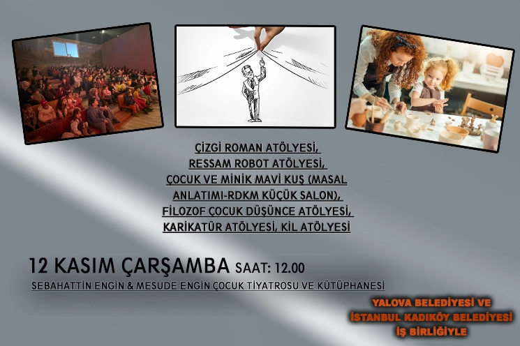 12 Kasım Çarşamba günü düzenlenecek olan çocuk atölyeleri, Sebahattin Engin & Mesude Engin Çocuk Tiyatrosu ve Kütüphanesi’nde saat 12.00’de başlayacak. Program kapsamında minik katılımcılar; Çizgi Roman Atölyesi, Ressam Robot Atölyesi, Filozof Çocuk Düşünce Atölyesi, Karikatür Atölyesi, Kil Atölyesi gibi farklı sanatsal ve düşünsel etkinliklerle buluşacak. Ayrıca Çocuk ve Minik Mavi Kuş adlı masal anlatımı etkinliği, RDKM Küçük Salon’da çocuklara keyifli bir hikâye deneyimi yaşatacak.