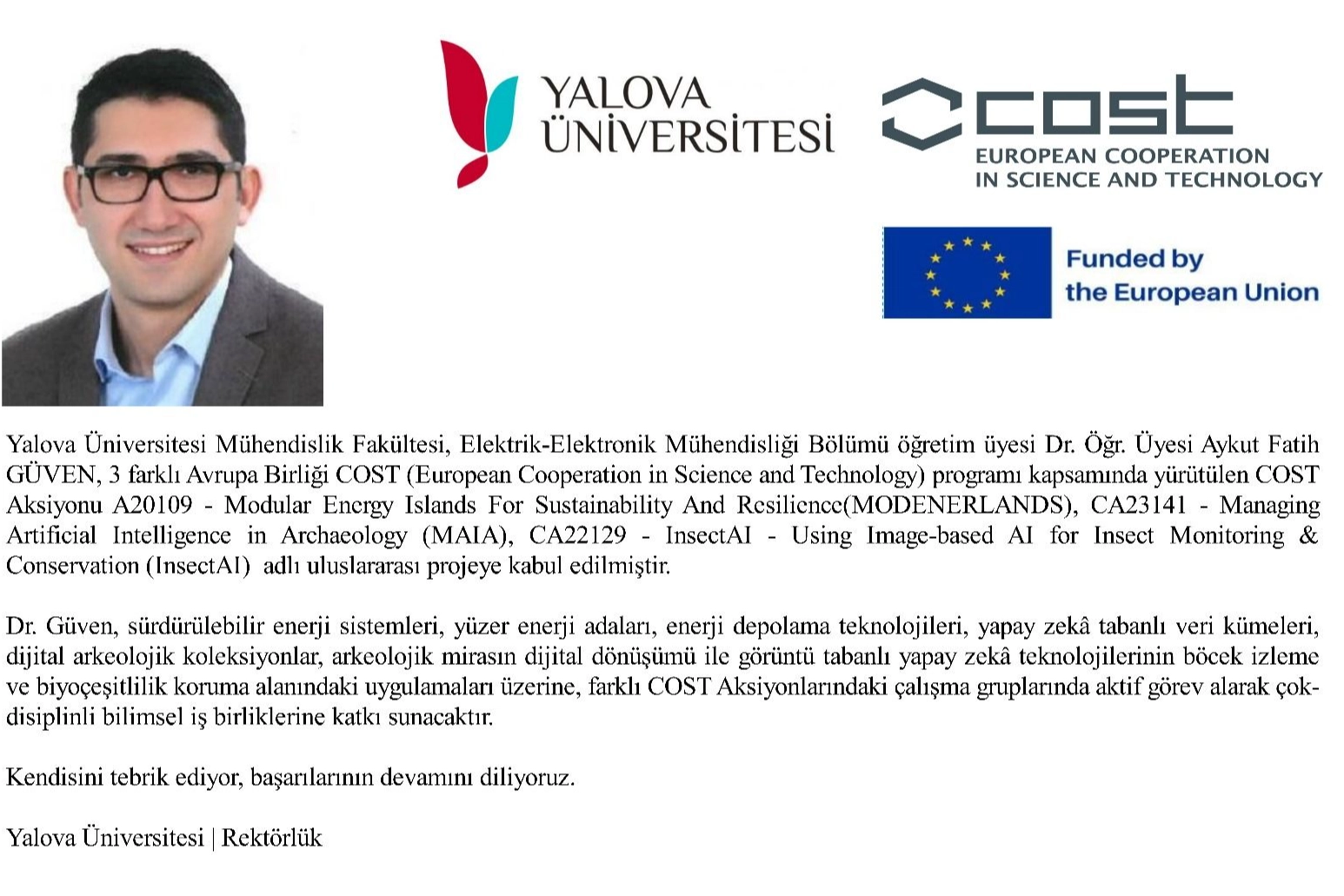 Dr. Güven, CA20109 – MODENERLANDS (Modular Energy Islands for Sustainability and Resilience) başlıklı COST Aksiyonu kapsamında, Working Group 3 – Network, Energy Storage and Resilience Analysis çalışma grubuna resmi üye olarak kabul edildi.
