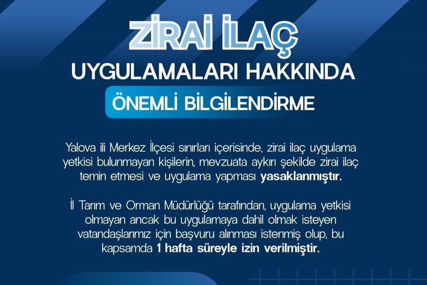 İl Tarım ve Orman Müdürlüğü tarafından yetkisi bulunmayan ancak zirai ilaç uygulaması yapmak isteyen vatandaşlar için 1 hafta süreyle kayıt başvurusu alınacağı bildirildi. Uygulamaya dahil olmak isteyen vatandaşların; ad-soyad, T.C. kimlik numarası ve cep telefonu bilgileriyle birlikte mahalle muhtarlıklarına başvurarak kayıt yaptırabilecekleri ifade edildi. Yetkililer, belirtilen süre sonunda kaydı bulunmayan kişilerin zirai ilaç uygulaması yapmasına izin verilmeyeceğini vurgulayarak, uygulamanın hem çevre hem de insan sağlığının korunması amacıyla hayata geçirildiğini kaydetti.