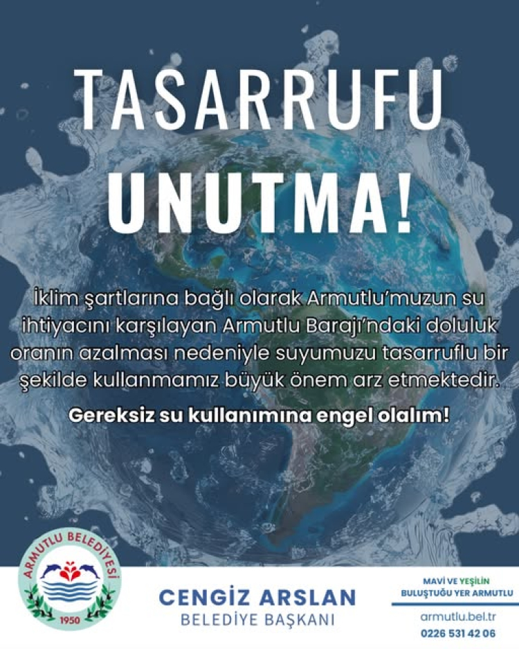 Armutlu Belediyesi, su kaynaklarının hızla tükenmesine dikkat çekerek vatandaşlara suyu tasarruflu kullanma konusunda önemli bir çağrıda bulundu. Belediye tarafından yayımlanan “Tasarrufu Unutma!” başlıklı bilgilendirme mesajında, suyun yaşam için vazgeçilmez bir kaynak olduğuna ve bilinçli tüketimin geleceğin temel güvencesi olduğuna vurgu yapıldı.