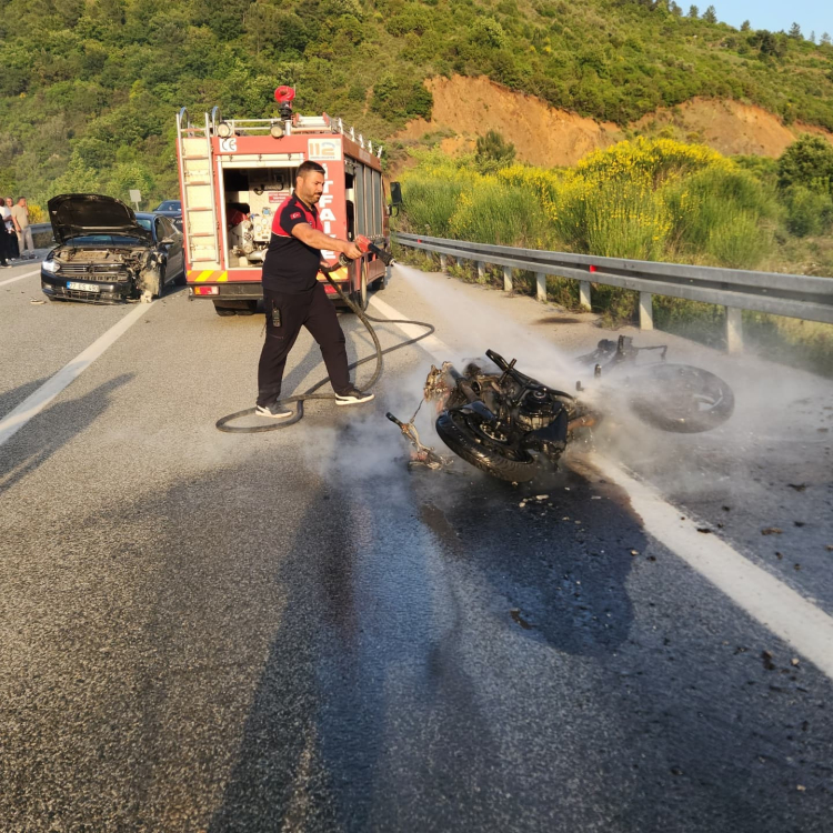 Yalova’nın Armutlu ilçesi NATO Yolunda bir otomobil ve motosiklet çarpıştı. Çarpmanın etkisiyle alevlere teslim olan motosiklet küle döndü.