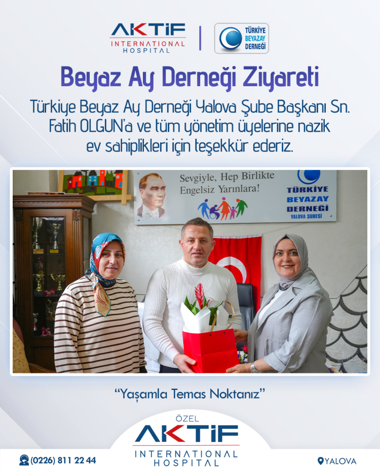 Toplumsal farkındalık ve dayanışma projelerine verdiği önemle bilinen Aktif International Hospital, otizm konusunda farkındalık oluşturmak ve engelsiz bir yaşam hedefine destek vermek amacıyla Beyaz Ay Derneği Yalova Şubesi ile bir araya geldi. Yalova Şube Başkanı Fatih Olgun ve yönetimi ile birlikte önemli konular üzerine istişarelerde bulunan yetkililer, herkes için eşit ve erişilebilir bir yaşam hedefiyle yürütülen bu kıymetli çalışmaların artarak devam etmesini temenni etti. Ziyaret, günün anısına çekilen toplu hatıra fotoğrafı ve karşılıklı iyi dilek temennileri ile birlikte sona erdi.