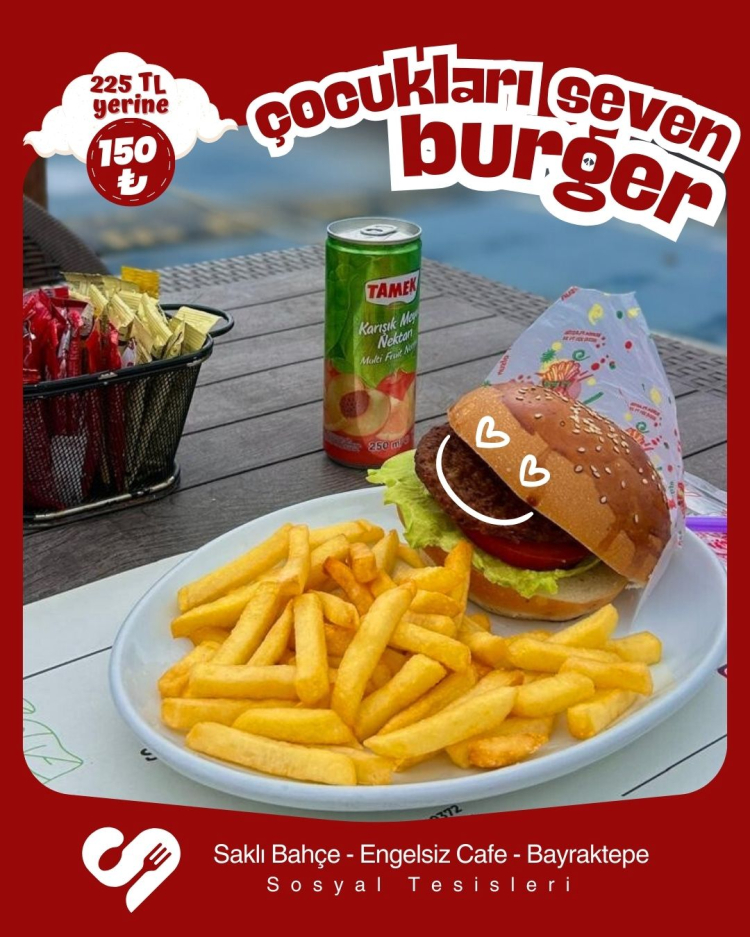 Özel indirim kampanyası kapsamında Bayraktepe Sosyal Tesisleri, Engelsiz Kafe ve Saklı Bahçe Sosyal Tesisleri’nde çocuk hamburger menüsü, 225 TL yerine 150 TL’den satışa sunulacak. Kampanya, ara tatil sonuna kadar devam edecek.