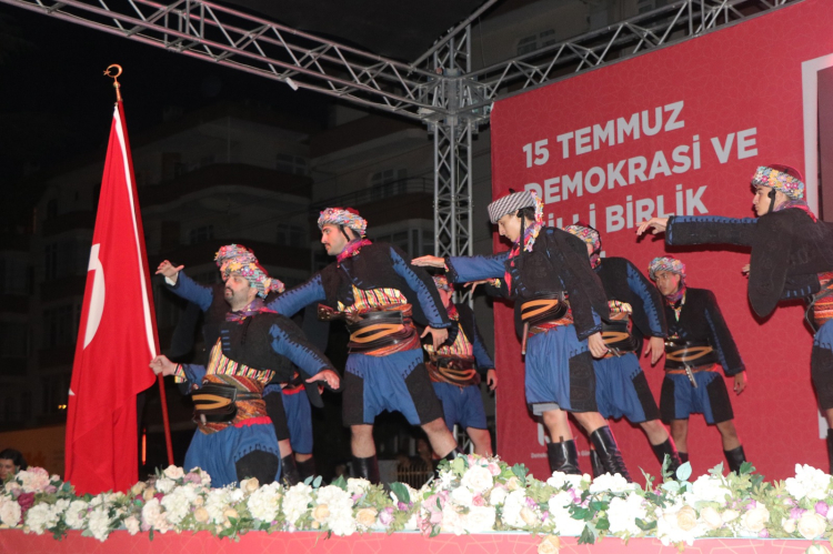 Gecede sahne alan Anka Dans Topluluğu, İzmir yöresi halk oyunları ve zeybek gösterisiyle gönülleri fethetti. Anka Dans Topluluğu’nun gösterisi sonrasında Mokamp Alanında kurulan dev ekranda Cumhurbaşkanı Recep Tayyip Erdoğan’ın halka seslenişini canlı olarak yayınlandı.
