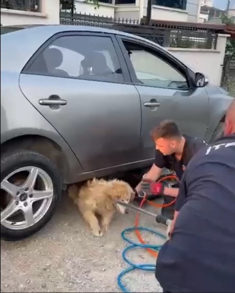 Alınan bilgiye töre trafikte seyir halindeki aracın önüne aniden köpek çıktı. Köpeği son anda fark eden aracın sürücüsü son anda firene bastı ama duramadı. Aracın çarptığı köpek otomobilin altına girerek mahsur kaldı.