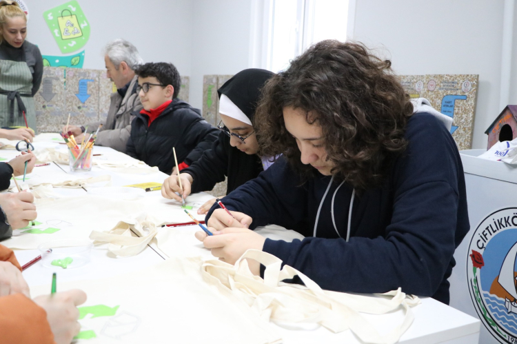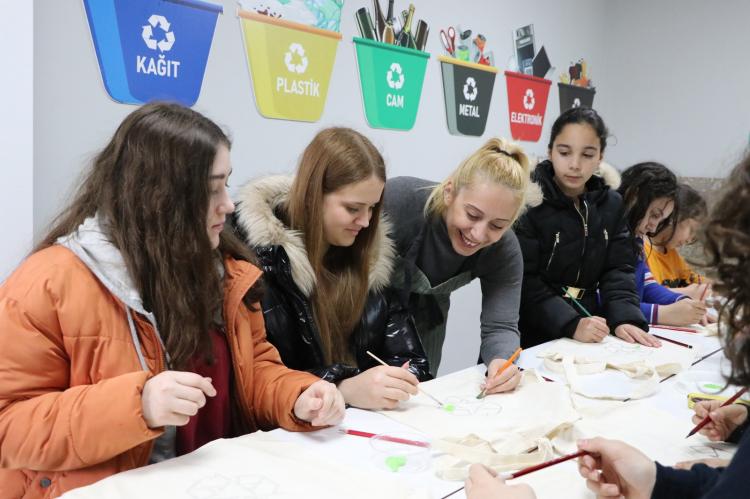Etkinliğin devamında gerçekleştirilen bez çanta atölyesi renkli görüntülere sahne oldu. Öğrenciler, bez çantalar üzerine geri dönüşüm temalı figürler çizerek çevre bilincini sanatla bir araya getirdi.