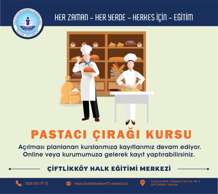 Yalova Çiftlikköy Halk Eğitimi Merkezi, yeni açılacak olan Okuma Yazma, Pastacı Çırağı, Jel Mum Yapımı gibi kurs duyuruları ile dikkat çekiyor.