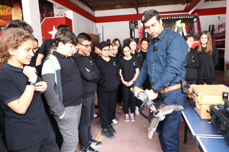 Okulun Fen Bilimleri Öğretmenleri Derya Tayhan Kütük ve Abdülkadir Çelik’le birlikte itfaiyeyi ziyaret eden 60 öğrenci, Çiftlikköy Belediyesi İtfaiye Amiri Süleyman Çark’ın anlattığı ipli kurtarma mekanizmalarını ilgiyle inceledi.