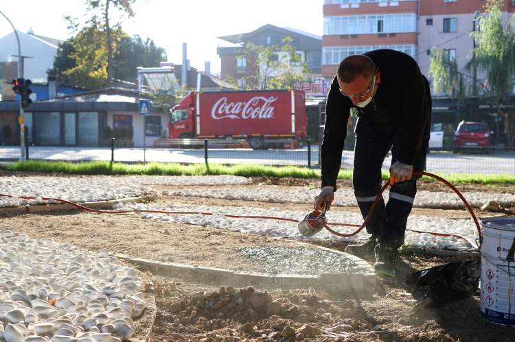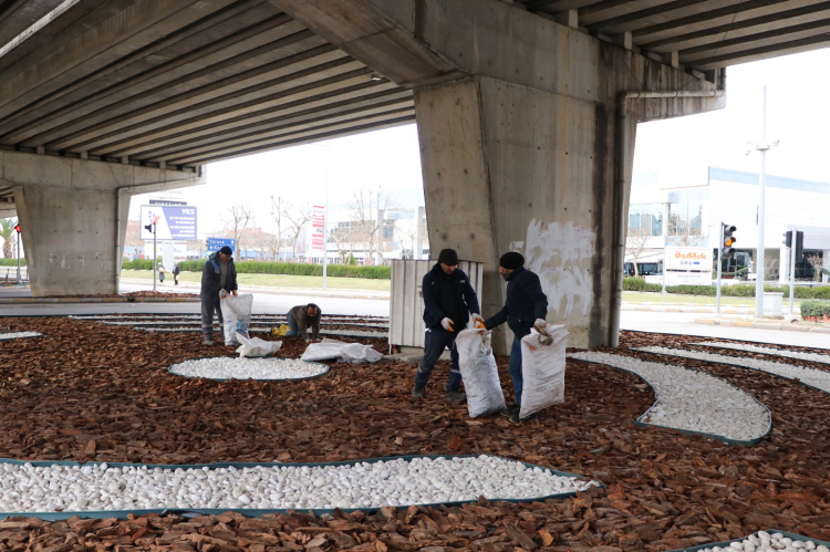 Düzenleme kapsamında zemin dolgusu ağaç kabuklarıyla oluşturulurken, zemin çerçevesi içerisinde sarı, beyaz ve yeşil renkli dolomit taşları kullanıldı.
