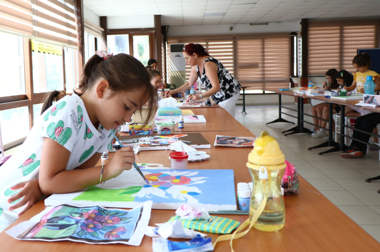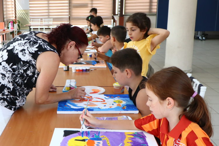 Karakalem tekniklerinden akrilik boya desenlerine, perspektif kurallarından fırça tekniklerine kadar pek çok farklı bilgiyi öğretmenlerinden alan geleceğin Picasso’ları, yaz dönemi sonunda gerçekleştirecekleri sergi için tuval üzerinde titizlikle çalışıyor.