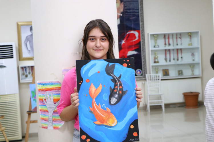 Resim kursu öğretmenlerinden Elif Akbaş, resme adım atan minik öğrencilerin karakalemden sulu boyaya, akrilikten guaja kadar çeşitli teknikler kullanarak yaklaşık 100 eser ortaya çıkardığını dile getirerek, “Resim sanatıyla ilgili temel bilgileri verdiğimiz öğrencilerimiz, 3 ay gibi kısa bir sürede pek çok eser yaptı. Umuyoruz ki kurslarımızda öğrendikleri bilgileri, gelecekte yapacakları birçok resimde de en güzel şekilde kullanacaklardır” dedi.