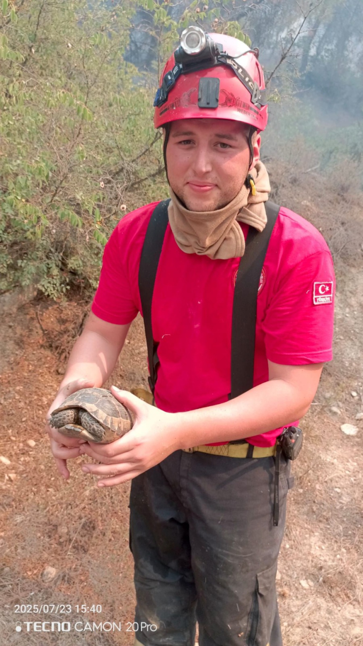 Çark, “Ekiplerimizden gelen bilgi, yangının büyük oranda kontrol altına alındığı ancak alevlerin yeniden büyüdüğü yönündeydi. Oradaki tüm ekipler, bizim ekibimiz de dahil olmak üzere alevlere karşı canla başla mücadeleyi sürdürüyor” diye konuştu. Öte yandan itfaiyecilerin orman yangınından etkilenen bir kaplumbağayı alevlerden kurtararak soğuk suyla serinletmesi de objektiflere yansıdı.
