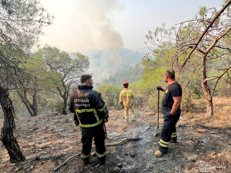 Günlerdir bölgede yangınla mücadele eden Çiftlikköy Belediyesi İtfaiye Müdürlüğü ekipleri bir yandan da hayat kurtarıyor.