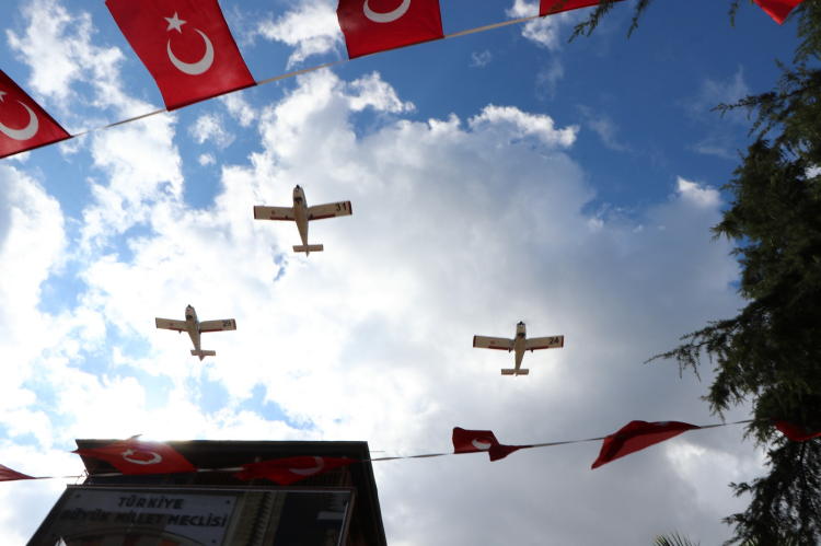 Atatürk Anıtı’na çelenk sunumlarının yapılmasının ardından günün anlam ve önemini belirten konuşmayı yapan Teğmen Ömer Faruk, “Atatürk’ün 19 Mayıs 1919’da Samsun’a çıkarak başlattığı Ulusal Bağımsızlık Savaşı, 30 Ağustos 1922 günü dünyanın en güçlü devletleri tarafından desteklenen işgalci Yunan ordusuna karşı kazanılmış olan Başkomutanlık Meydan Muharebesi ile amacına ulaşmıştır. 102 yıl önce özgürlüğün bedelini kanlarıyla ödeyerek bizlere bu güzel yurdu hediye eden Kurtuluş Savaşı’nın tüm kahraman şehitlerine Allah’tan rahmet, gazilerimize ise sonsuz şükranlarımızı bir kez daha sunar, bu güzel ve coşkulu bayram gününde Türk ulusunu bölmek, zayıflatmak ve çökertmek hayallerini kuranlara, Türk ulusunun ulusal egemenliğini ve bölünmez bütünlüğünü bozmaya hiç kimsenin gücünün yetmeyeceğini bir kez daha hatırlatmak isteriz” dedi. Konuşmaların ardından 126. Filo Komutanlığı’nın T-41 uçaklarıyla yapılan gösteri uçuşu ise alkışlarla izlendi. Kaymakam Ada, Başkan Yele ve Garnizon Komutanı Uysal’ın kaymakamlık makamında ilçe protokolü ile bayramlaşmasının ardından yapılan kokteyl ile kutlama programı sona erdi.