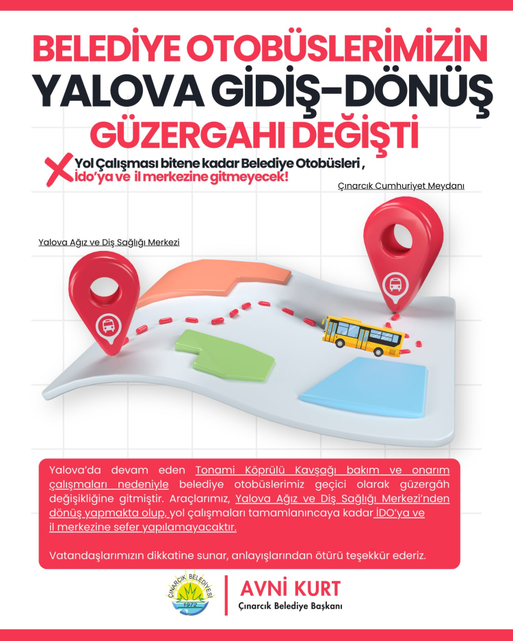 Çınarcık Belediyesi’nden yapılan açıklamada “Yalova’da devam eden Tonami Köprülü Kavşağı bakım ve onarım çalışmaları nedeniyle belediye otobüslerimiz geçici olarak güzergâh değişikliğine gitmiştir. Araçlarımız, Yalova Ağız ve Diş Sağlığı Merkezi’nden dönüş yapmakta olup, yol çalışmaları tamamlanıncaya kadar İDO’ya ve il merkezine sefer yapılamayacaktır. Siz değerli vatandaşlarımıza anlayışınız için teşekkür ediyoruz. Gelişmeler oldukça kamuoyunu bilgilendirmeye devam edeceğiz” denildi.