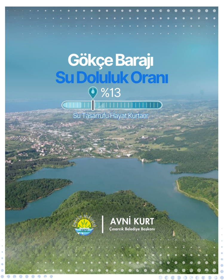 Çınarcık Belediyesi yaptığı açıklamada “Sevgili hemşehrilerimiz Yeşil Körfez Su Birliği’nden almış olduğumuz bilgiye göre, yetersiz yağışlar ve küresel ısınmanın etkisiyle Gökçe Barajı’ndaki su seviyesi hızla azalıyor. Mevcut doluluk oranıyla yaklaşık 24 günlük su rezervimiz kaldı.